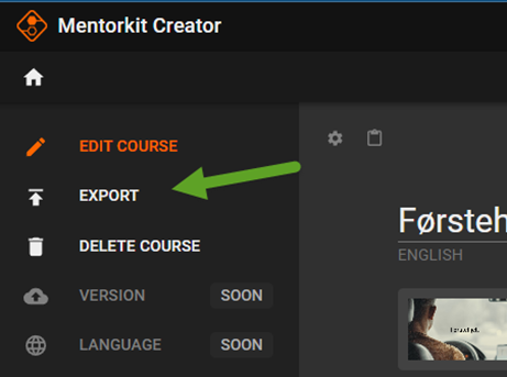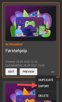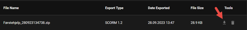 Når kurset er ferdig produsert må det eksporteres i form av en ZIP-fil. Dette kalles oftest å lage en SCORM-pakke. Klikk på «Export».