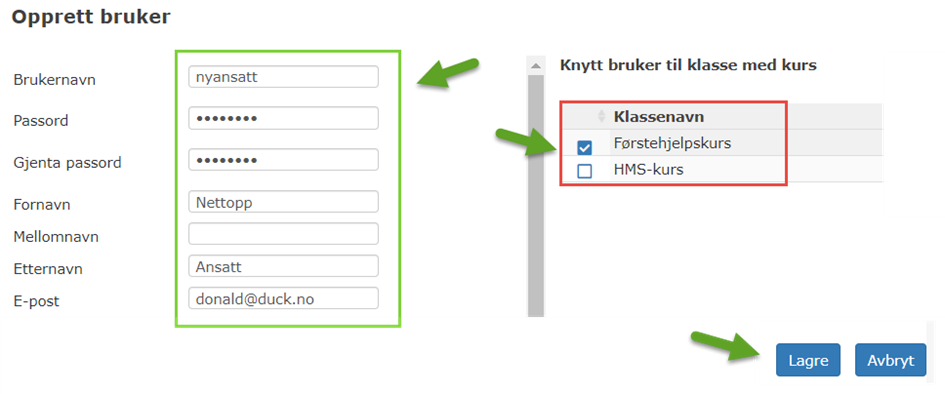 Merk av gruppen(e) som inneholder de kursene som vedkommende skal ta. Klikk deretter på lagre.