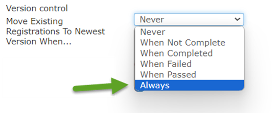 Dette er et viktig anliggende. For å flytte alle gjennomføringer til den nye versjonen av kurset så gjør dette (dersom det bare en noen få endringer). Klikk på