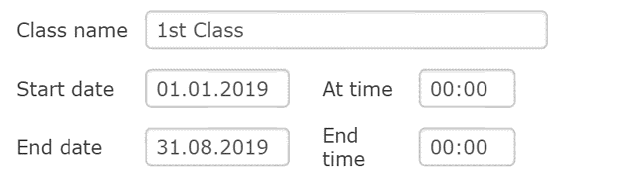 You can set the on and off date for a class. Here you see, for example, the class “1st class”, which will apply from January 1st to June 30th, 2019.