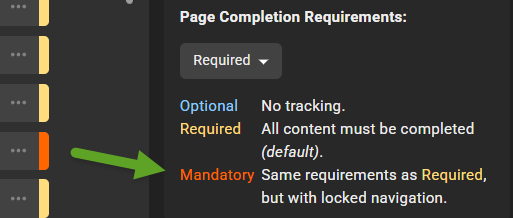 When a page is marked as “mandatory” all the elements on the page must be completed / done before the user can navigate to the next page. Eg the entire video must be seen or the exercise must be submitted before the next button is activated . It is not possible to use the menu to go to pages after the mandatory page(s). Until now it is only video embedded from Vimeo that can be mandatory.