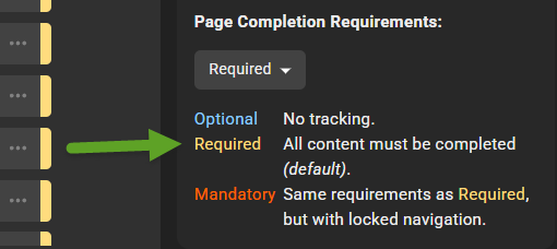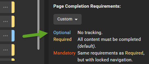 Pages marked with “optional” don’t count in the summary at the end of the course. If a course has 10 pages and 5 of them are optional it is only the 5 marked as complete or mandatory pages / excercises that counts in the result page at the end of the course. A course with all the pages set to optional is completed when the course is opened. Optional pages that are completed or not visited are marked like this in the menu: