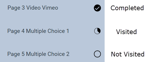 b) If the page contains one or more interactive elements the user must finish the elements before the page is marked as completed. Otherwise the page is marked as “visited”. As default a video must be started to mark the page as completed and exercises must be submitted.