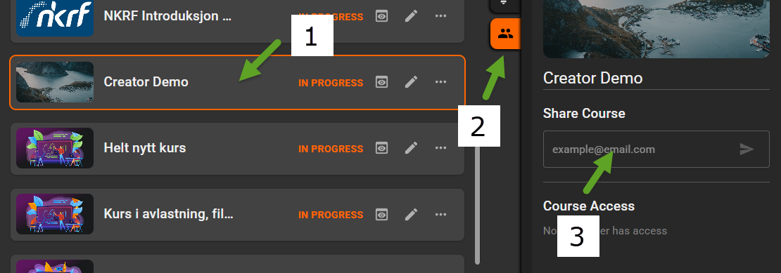 If want to share a course with an other person, or persons, - just click on the course, then click on the symbol on the right column and finally fill in the correct email for the person. The course will then be available for editing. The persons you share with must have a valid license.