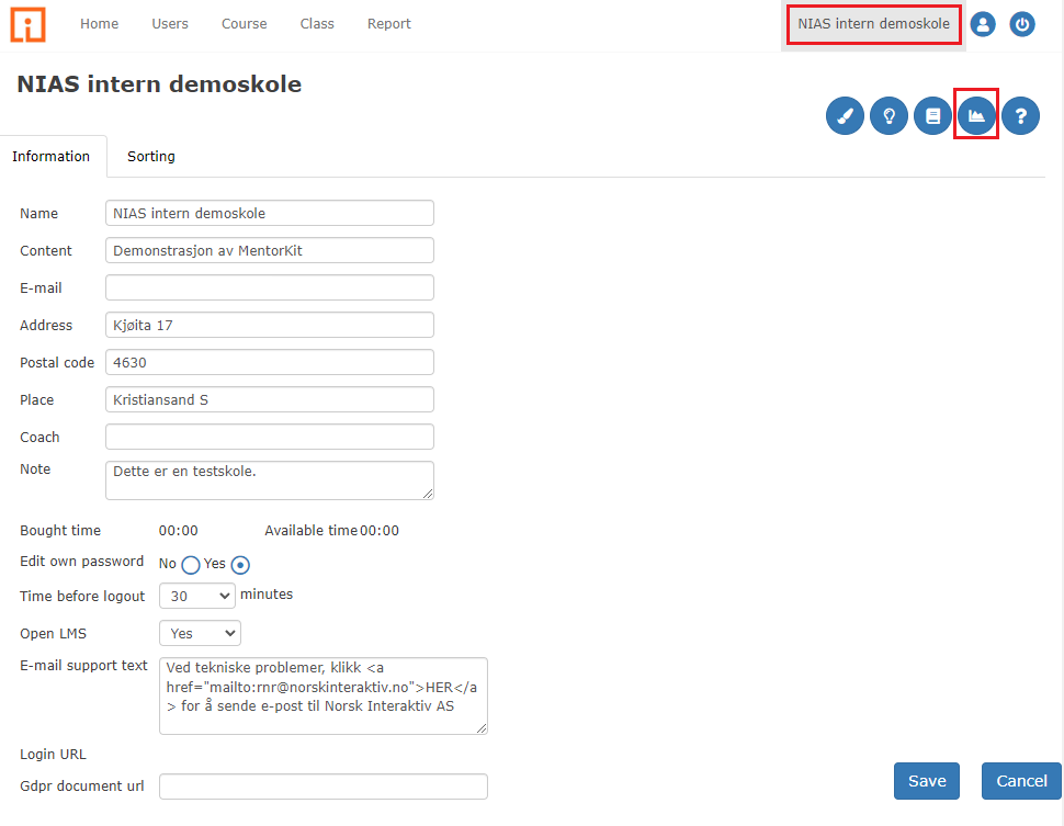 Click the “School name” in the upper right corner in the main menu.